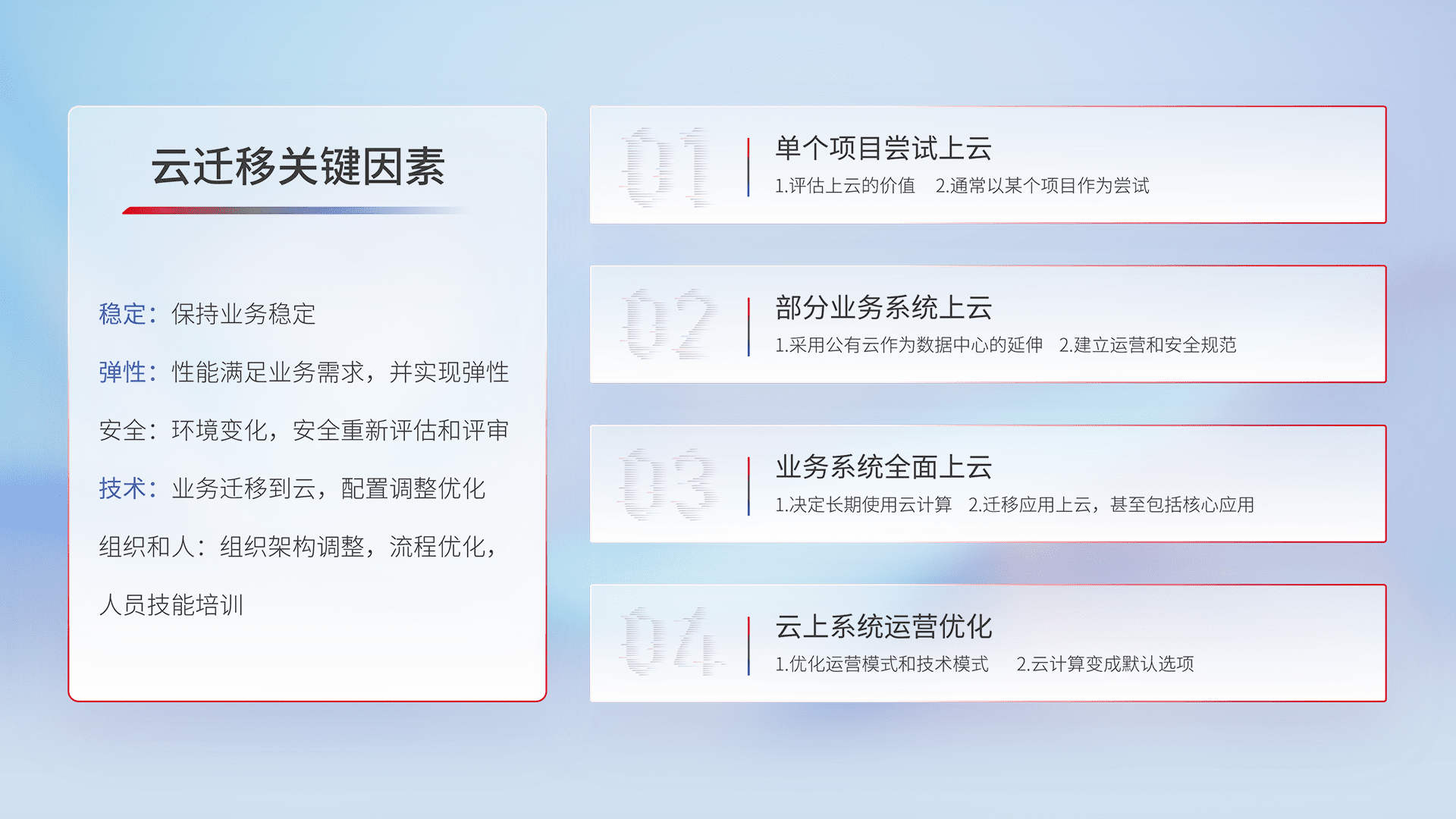 结合实际业务,,从规划设计、、云平台选型、、云原生改造、、、数据迁移、、、集成交付,,,,迁移全过程为客户识别最佳上云路径,,,做好风险识别管理,,,,设计网络架构、、、、身份权限、、安全审计合规、、、、操作审计、、日志审计、、、、监控告警策略、、多站点容灾设计等,,,对云上基础设施进行整体规划,,,提升IT治理水平,,以满足弹性、、、、高可用、、、高性能的需求。。