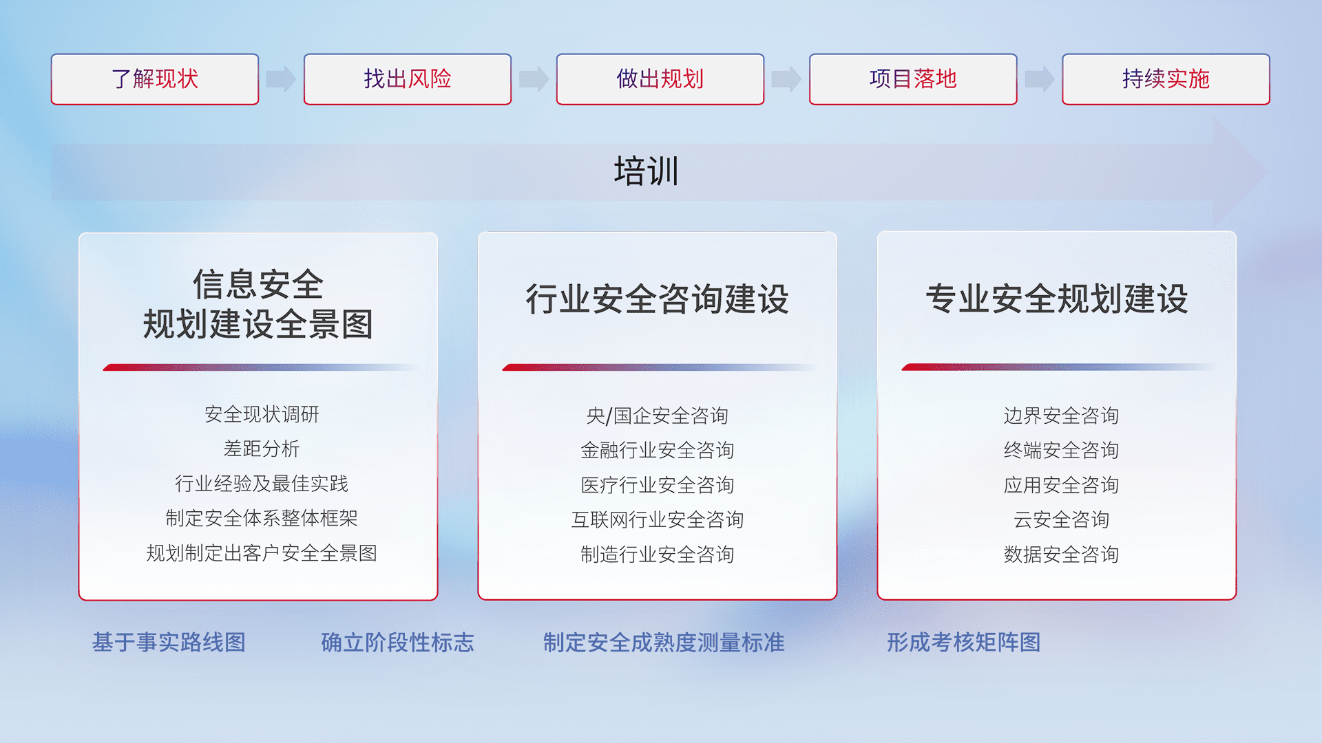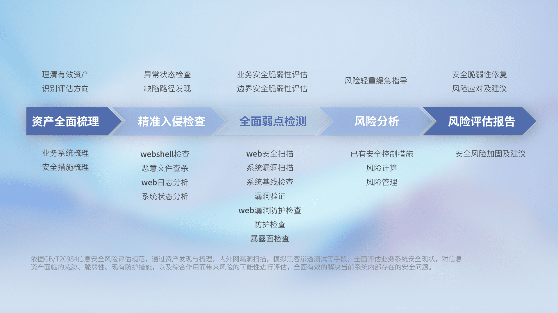 针对客户行业特性,,,以专业的安全服务+多厂商联合解决方案提供专属的一站式安全管理服务,,,,帮助客户全面感知网络空间威胁,,,,基于识别、、、、检测、、、、分析、、、防护、、监测、、、、响应的服务理论模型,,,从方案咨询、、、集成交付、、、、评估验证、、优化加固、、、、运维运营,,,,致力于为客户提供完整的闭环管理式安全服务。。以实战经验为客户打造高抵御风险的安全体系,,帮助客户发现威胁、、对抗威胁、、处置威胁,,不断积累安全对抗能力,,持续保障数字化安全。。